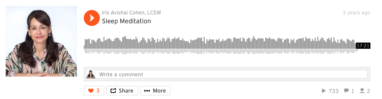 Iris’s Meditations Imagery to Support Awareness Imagery for Anxiety Sleep Meditation Share this: Share on X (Opens in new window) X Share on Facebook (Opens in new window) Facebook Like Loading...
